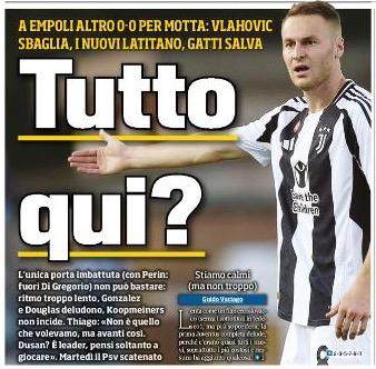足球媒体是迎风倒的,上一场尤文闷平恩波利,正式蜜月结束,审判开始,让意大利各大报过足了大批判的瘾,莫塔的“技战术革命”在诸位高价新援加入后,反而淡出鸟来。