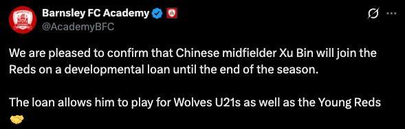 足球推荐-官方公告显示徐彬加盟的是巴恩斯利U21,并将同时效力狼队U21